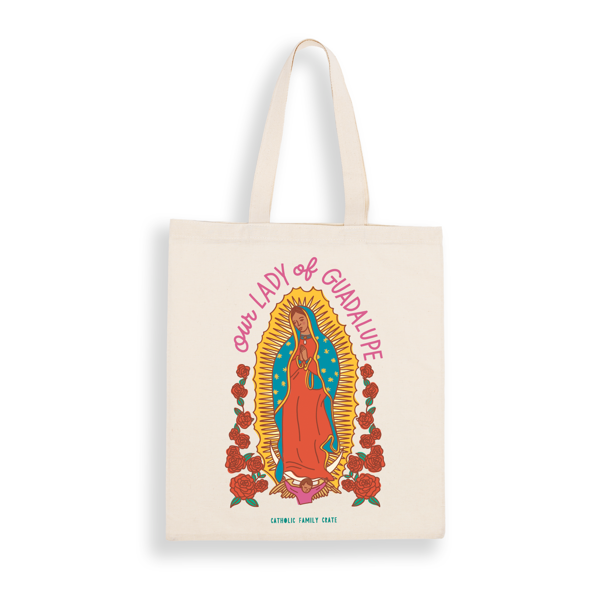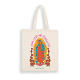 Share your Catholic faith and devotion to Our Lady of Guadalupe as you go throughout your day with this fun, colorful and faithful tote bag!