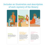 This pocket-sized Rosary Ring features 27 cards that vividly depict the Joyful, Luminous, Sorrowful, and Glorious Mysteries of the Rosary through hand-drawn illustrations in vibrant colors. Each card offers a simple meditation and scripture references to deepen your understanding of the Mysteries. The set also includes a detailed guide on how to pray the Rosary, breaking it down into easy-to-follow steps. Each part of the Rosary is clearly explained, making it accessible and engaging for both children and adults.