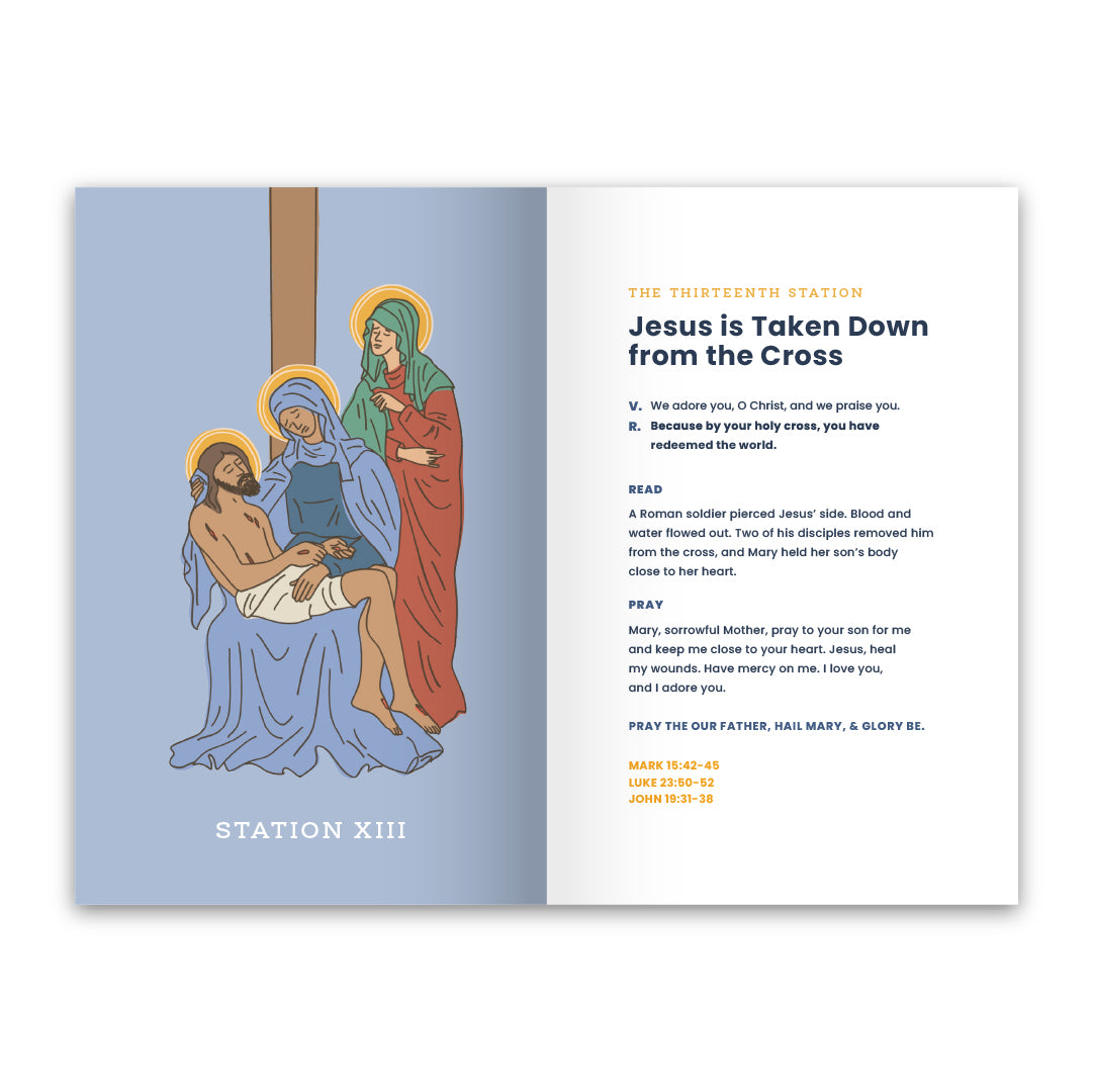 - Covers all 14 Stations of the Cross with prayers and reflections
